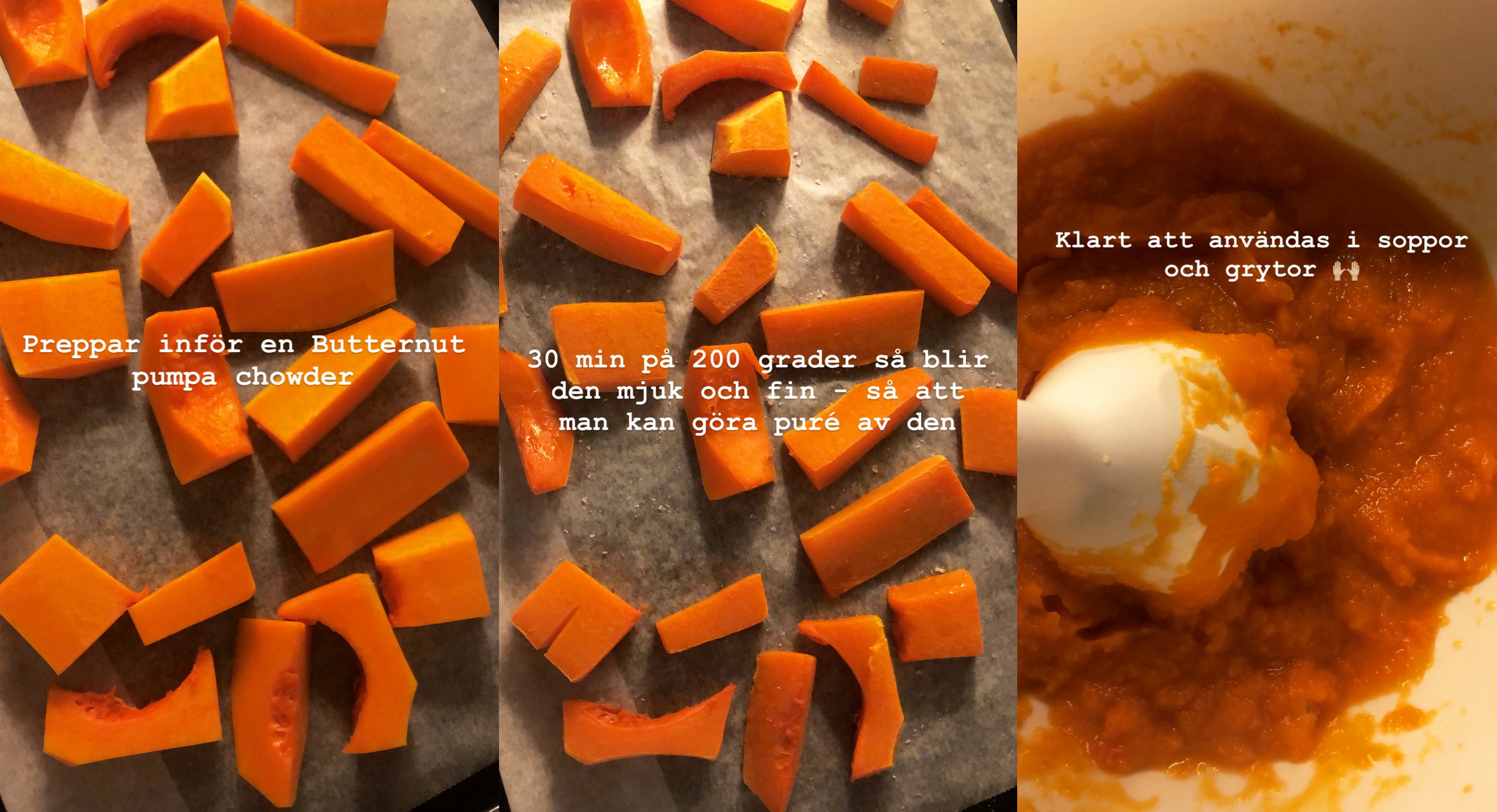 - Pumpapuré – 1 Butternutpumpa (ca 500g pumpakött) + 1/2 dl kokande vatten