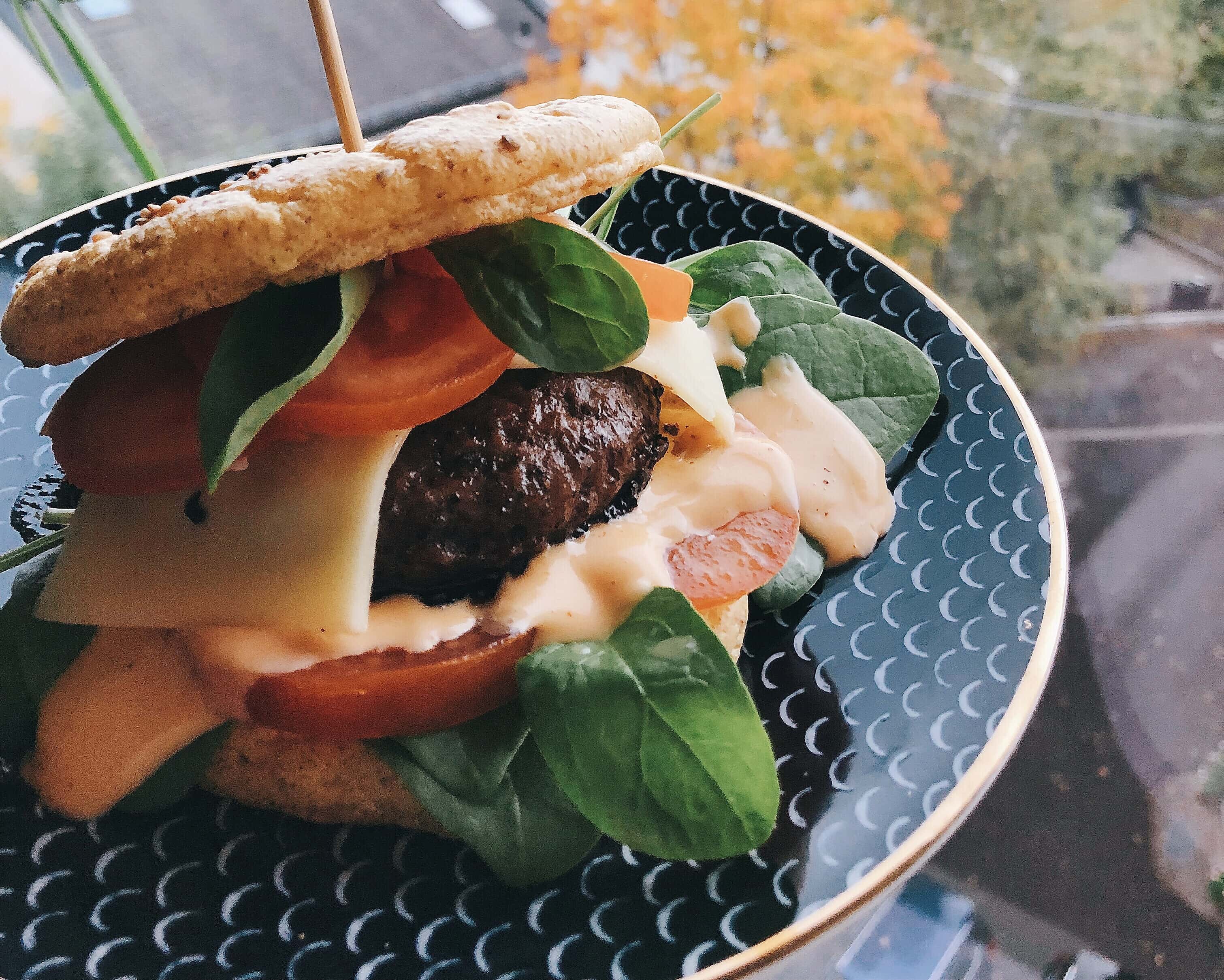Min lammburgare har massa gott på sig och kantas med två Oppsie-bröd. Det som är så bra med en hamburgare är att man kan kolla lite i kylen och se vad man har hemma. Så när du har testat receptet, experimentera gärna själv med dina favoriter.